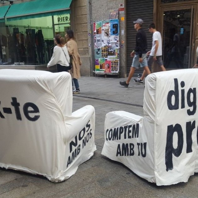 Es tracta de diversos sofàs i butaques coberts amb una tela blanca on s'hi han escrit missatges com "El teu lloc és a les places", "Uneix-te", "Digues prou" i "Comptem amb tu", entre d'altres.