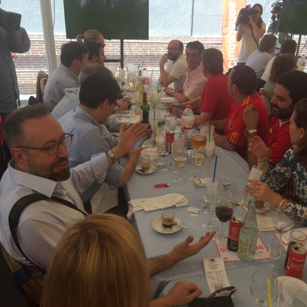 Ambient distès al restaurant Salamanca. Ciutadans ha decidit fer una pausa de campanya, com aquelles del migdia que ven l’anunci d’Estrella, per seguir el primer partit del conjunt de Vicente del Bosque en la fase de grups de l’Eurocopa. En una terrassa davant la platja de la Barceloneta, el cap de llista, Joan Carles Girauta, acompanyat de gairebé una trentena de membres de la formació, ha gaudit d’entrants d’embotits, paella i vi bo.