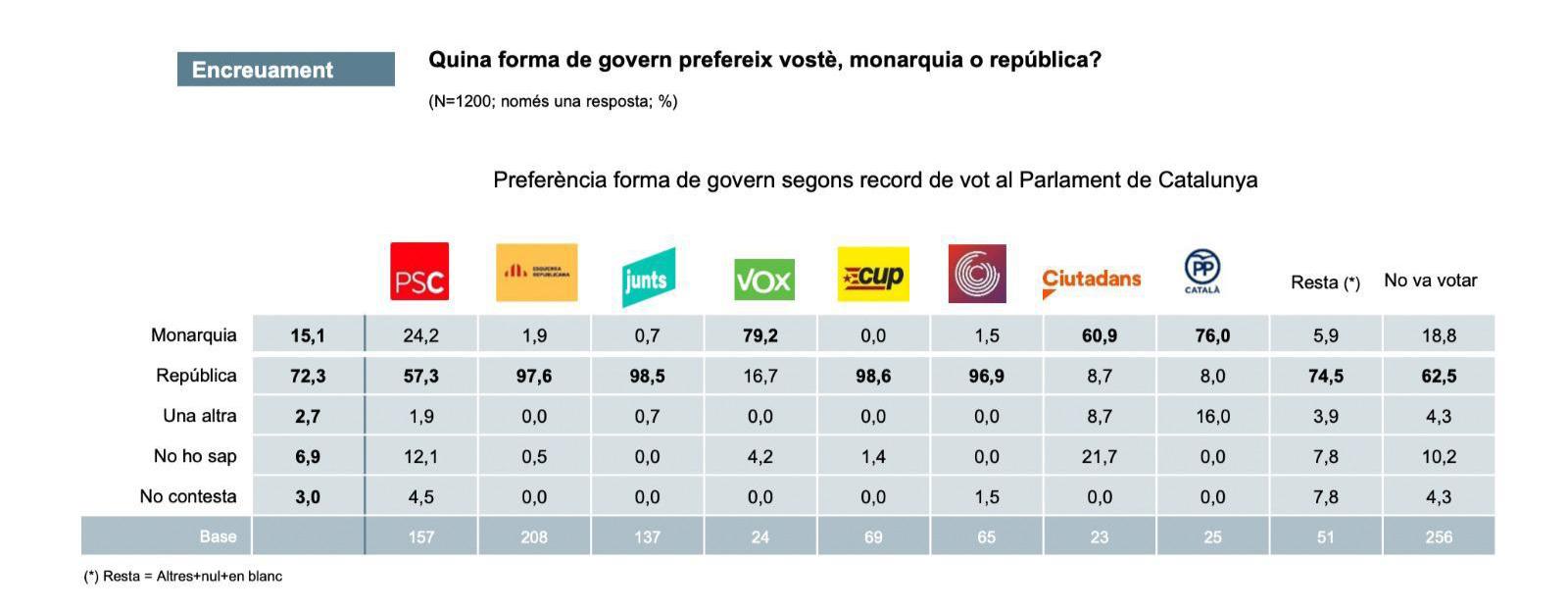 Posant la mirada en un altre gràfic es pot comprovar que els simpatitzants socialistes a Catalunya preferirien que a l'Estat espanyol desaparegués la monarquia. Més del 57% dels enquestats responen que la seva forma de govern preferida per a Espanya seria una República. Només una quarta part són favorables a mantenir la corona.