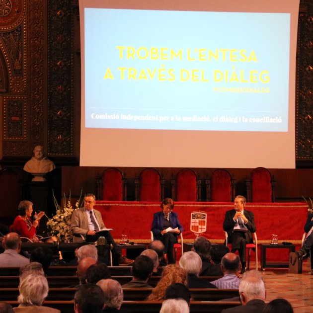 El paranimf de la Universitat de Barcelona (UB) ha quedat petit davant l'expectació aixecada per un acte convocat per la Comissió Independent per al Diàleg, la Mediació i la Conciliació, formada per representants sindicals, patronals, universitats i altres col·legis professionals, L'objectiu d'aquesta Comissió és trobar una sortida pactada al problema català mitjançant el diàleg, i aposta per fugir de "posicions extremes". "Trobem l'entesa a través del diàleg", afirma l'eslògan de la Comissió.