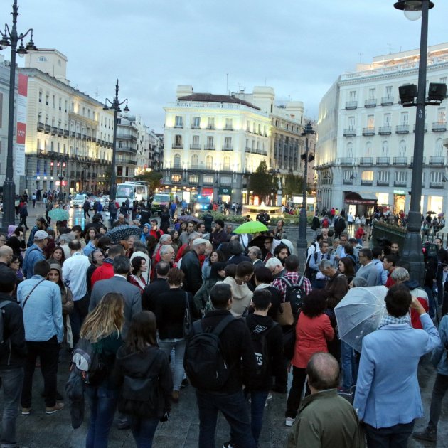 Gairebé un centenar de persones s'han concentrat aquest dimarts a la Puerta del Sol per demanar la llibertat dels presidents de l'Assemblea Nacional Catalana (ANC) i d'Òmnium Cultural, Jordi Sànchez i Jordi Cuixart.