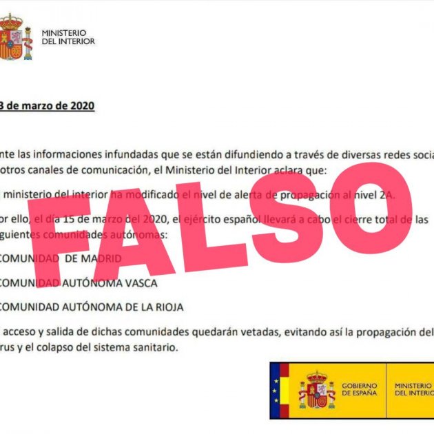 En el seu missatge, la Secretaria d’Estat de Comunicació n’adjunta un exemple. És un suposat comunicat del govern espanyol, que assegura que “el Ministeri de l'Interior ha modificat el nivell d’alerta de propagació al nivell A-2”. El suposat comunicat continua assenyalant que, a partir de demà, “l’Exèrcit espanyol durà a terme el tancament total de les següents comunitats autònomes: Comunitat de Madrid, Comunitat Autònoma Basca i la Comunitat Autònoma de La Rioja”. El document fals conclou que “l’accés i sortida d’aquestes comunitats quedaran vetats, evitant així la propagació del virus i el col·lapse del sistema sanitari”.