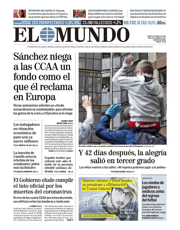 Al seu torn, El Mundo informa: "I 42 dies després, l’alegria va sortir en tercer grau". Vaja, a banda de no coincidir amb l’ABC en el recompte de dies, el to és clar, els ciutadans volen llibertat i el govern no els ho permet. Que sigui per intentar salvar vides deu ser un aspecte secundari per aquests paladins de la llibertat.
