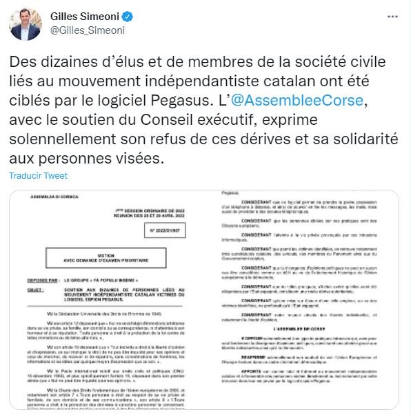 El Consell Executiu de Còrsega fa un pas endavant a favor del CatalanGate. El Consell juntament amb l'Assemblea de Còrsega exigeix una revisió prioritària sobre l'espionatge que s'ha realitzat a almenys 65 càrrecs electes i persones vinculades amb l'independentisme. El president del Consell de Còrsega, Gilles Simeoni, ha expressat en una piulada al seu compte de Twitter el seu suport a la societat catalana pel cas Pegasus i ha expressat solemnement el seu rebuig a aquests excessos. El document ha estat presentat pel grup Fà populu inseme. En aquest document es fa referència a la Carta Universal dels Drets Humans del 1948, i als articles 12 i 19 d'aquesta on es legitima que ningú serà objecte de la intromissió a la seva vida privada o la de la seva família i que tothom té dret a expressar la seva opinió lliurement.