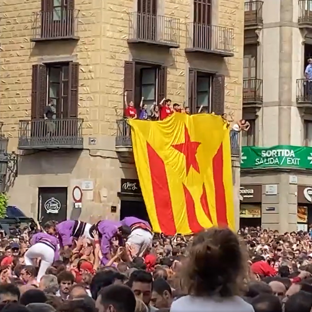 Crits d’independència a la plaça de Sant Jaume mentre es desplega una estelada gegant durant la Diada de la Mercè de les colles castelleres locals. Potser no ha ressonat fins a Guardamar, però és el que tenim. pic.twitter.com/rHHB804Qh2