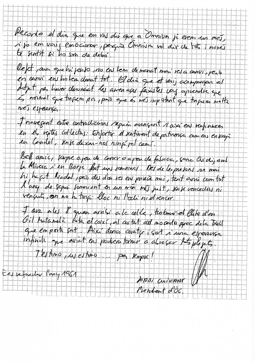"I ara, a les vuit, quan arribi a la cel·la, trobaré el llibre d’en Gil Matamala sota el coixí, al costat del mocador groc de la Txell que em porta sort", conclou el líder de l'entitat sobiranista. "Així doncs, coratge i sort. I una esperança infinita en què aviat ens podrem tornar a abraçar tots plegats".