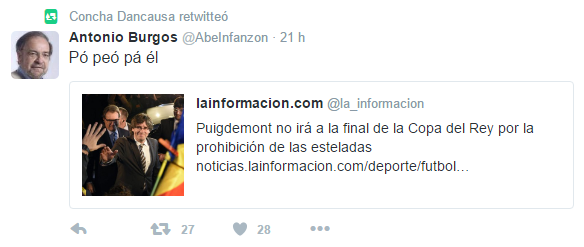 Dancausa ha retuitejat un missatge d'Antonio Burgos, escriptor i periodista de l'ABC, on es burla de la decisió de Puigdemont de no assistir al partit amb un: "Pues peor para él".