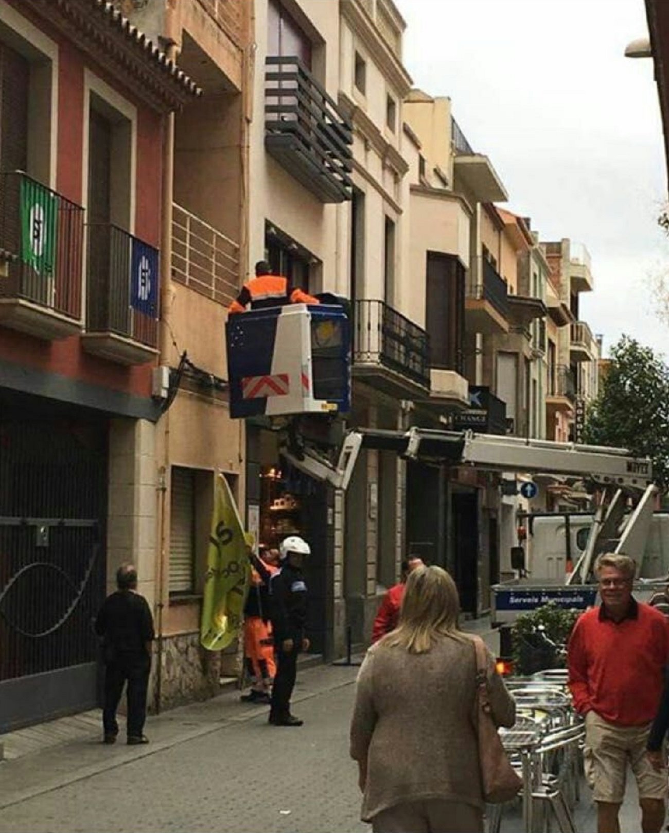 Una imatge publicada a través de Facebook mostra com diversos operaris retiren una banderola pel ‘sí’ al referèndum sota el control d’un policia local.