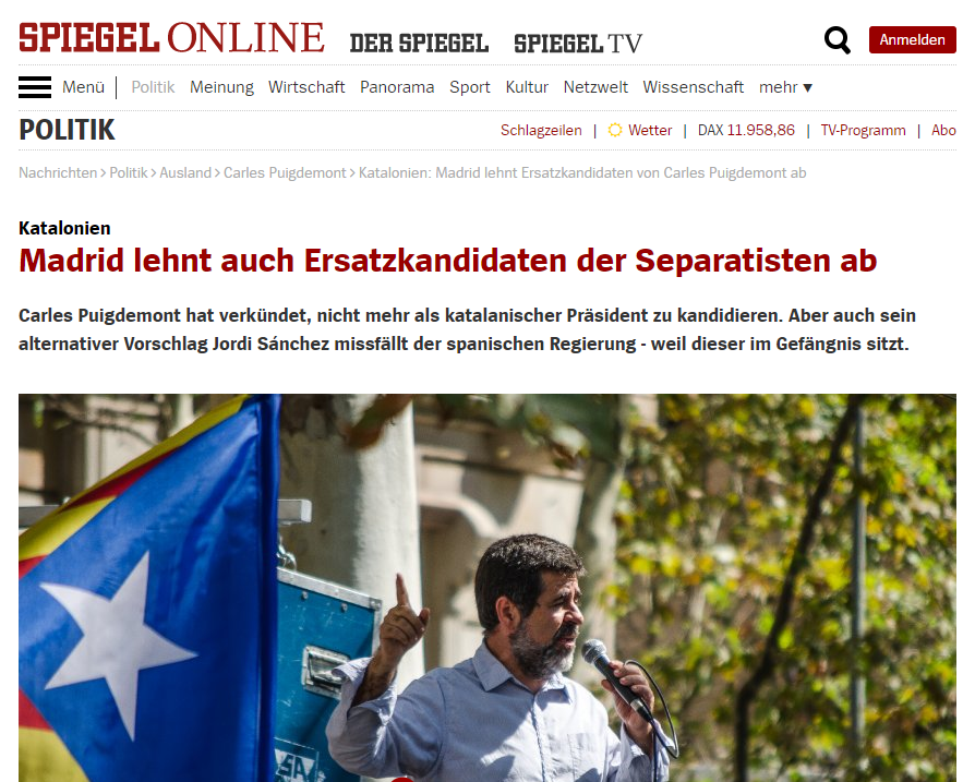 El setmanari Der Spiegel, el més important d'Alemanya, ha remarcat avui la negativa del president espanyol, Mariano Rajoy, a totes les propostes que sorgeixen de Catalunya. Cita la negativa a la investidura de Carles Puigdemont i també la del candidat alternatiu al govern autonòmic, Jordi Sànchez.