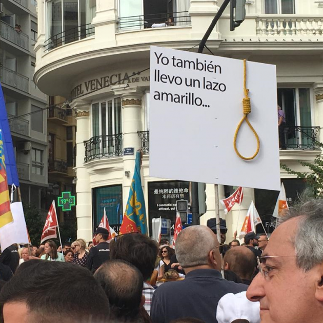 En el marc de la celebració de la diada del 9 d’Octubre al País Valencià s’ha pogut veure una pancarta en referència als llaços grocs en suport als presos polítics i els exiliats, en que el llaç s’ha convertit en una soga amb el nus utilitzat per penjar persones a la forca.