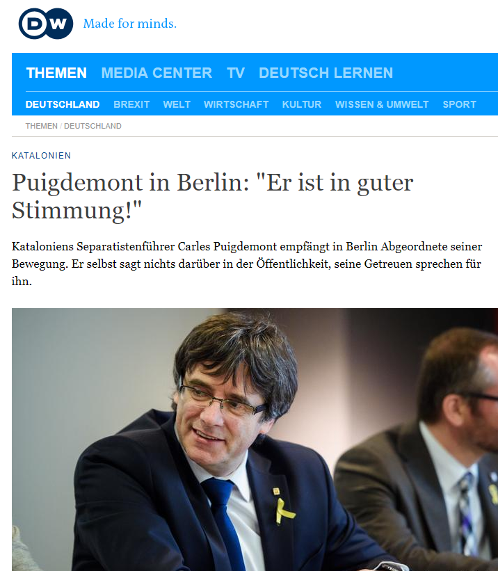 La televisió descriu que aquesta sensació ha arribat al president Carles Puigdemont i el seu entorn, i estan optimistes perquè creuen que l'euroordre d'extradició que va impulsar el jutge Pablo Llanera no prosperarà. En un reportatge titulat Puigdemont a Berlín: Està de bon humor!, la televisió alemanya explica el sentiment que ha trobat en la reunió del grup parlamentari de Junts per Catalunya a Berlín, que avui s'han trobat amb Puigdemont.