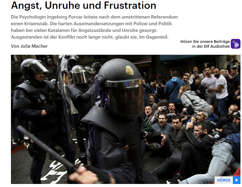 La ràdio pública alemanya Deutschlandfunk ha analitzat en un reportatge l'impacte psicològic que va tenir la repressió violenta contra el referèndum de l'1-O. La ràdio ha entrevistat la psicòloga de la UAB Ingeborg Porcar, de qui recorda que va coordinar un equip especialitzat després dels atemptats de Barcelona i Cambrils, i un altre després de l'actuació policial contra el referèndum.