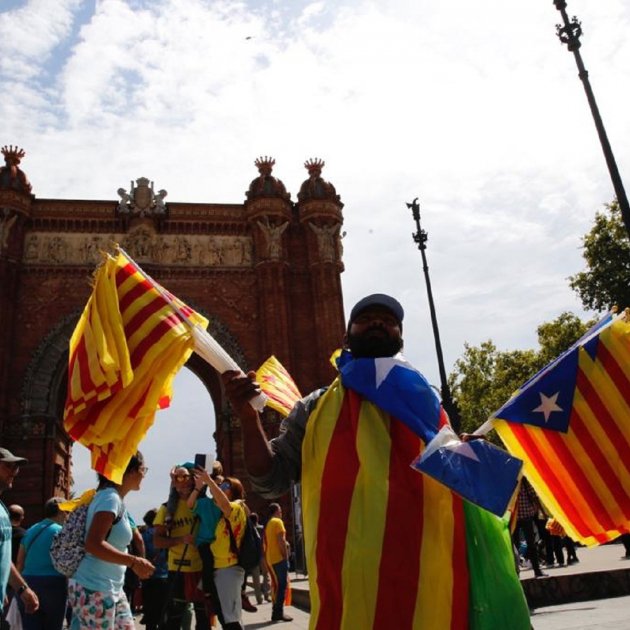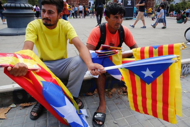 La majoria porten l'estelada de casa, aquella que ja han portat a moltes manifestacions, però per aquells que són nous, que se l'han descuidat, o que la que tenien ja està descolorida... la poden comprar als nombrosos venedors ambulants que avui recorren els carrers de Barcelona.