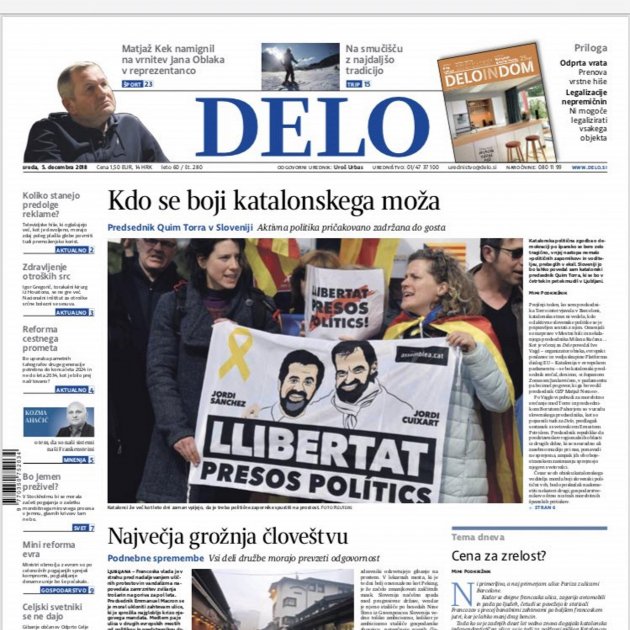 El diari eslovè Delo ha obert avui la portada preguntant-se "qui té por de la reivindicació catalana", coincidint amb la visita que hi farà aquesta setmana el president Quim Torra. El rotatiu informa dels actes a favor de l'alliberament dels presos polítics, i inclou diverses fotografies.