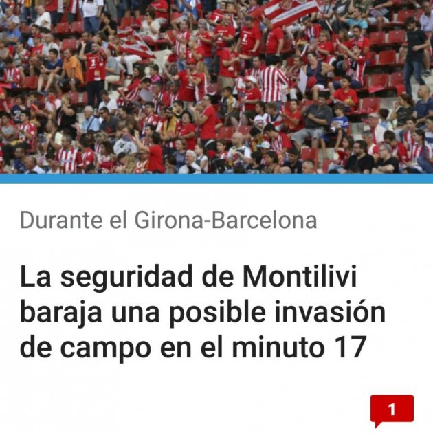 El diari Marca s'ha precipitat amb una previsió que finalment no s'ha complert. El rotatiu esportiu havia publicat una informació relacionada amb l'enfrontament esportiu entre el Girona i el Barça a Montilivi indicant que la seguretat de l'estadi contemplava una invasió del camp al minut 17 de partit.