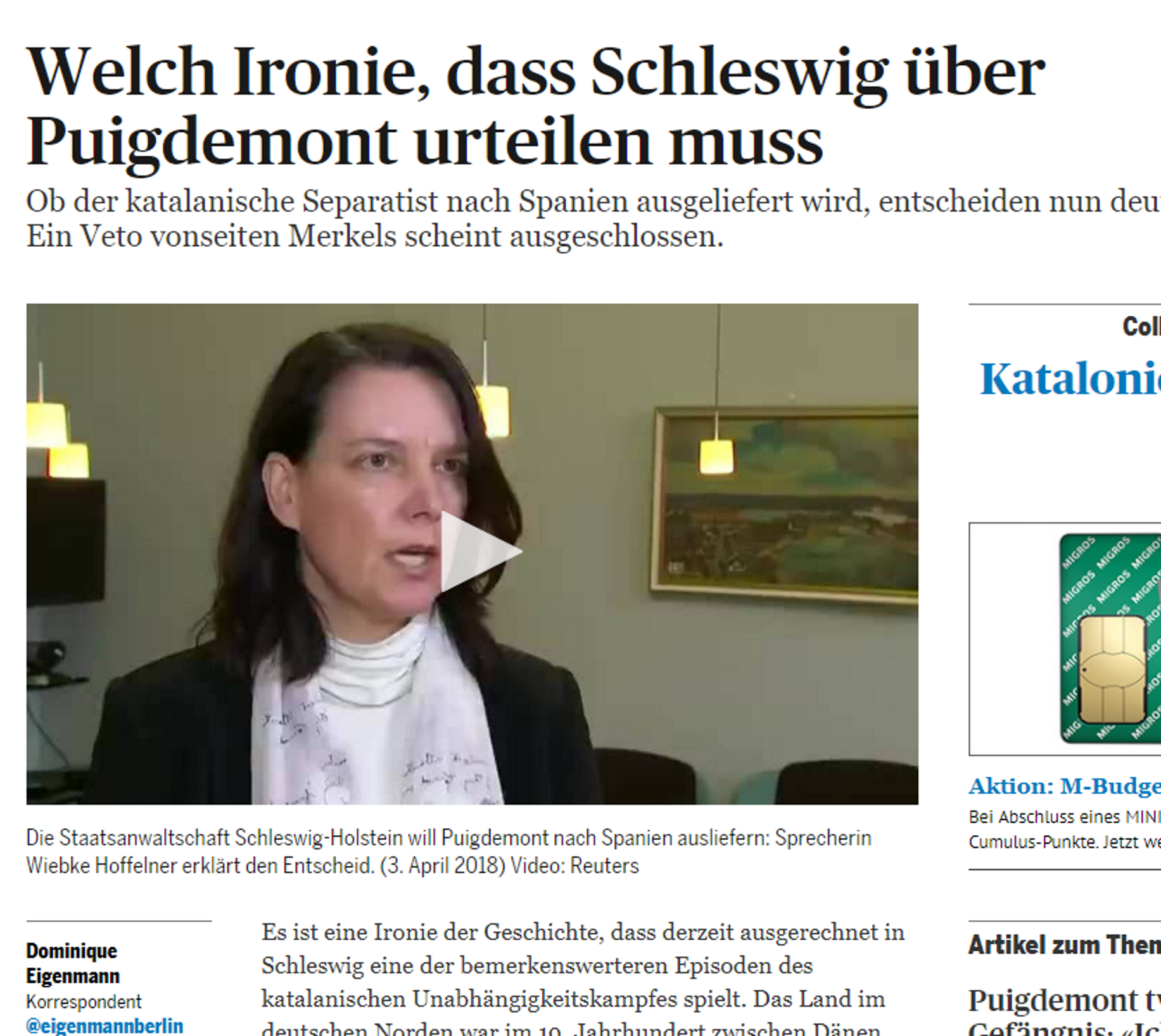 Segons Tages Anzeiger, la decisió de la Fiscalia del land d'admetre a tràmit l'euroordre contra el president Carles Puigdemont era previsible, però apunta que "molts juristes alemanys posen en dubte que es permeti l'extradició". "Tot i que Puigdemont va vulnerar sens dubte la Constitució espanyola amb el referèndum d'independència, argumenten que els seus delictes com a representant electe del poble català són de naturalesa política", afegeix.