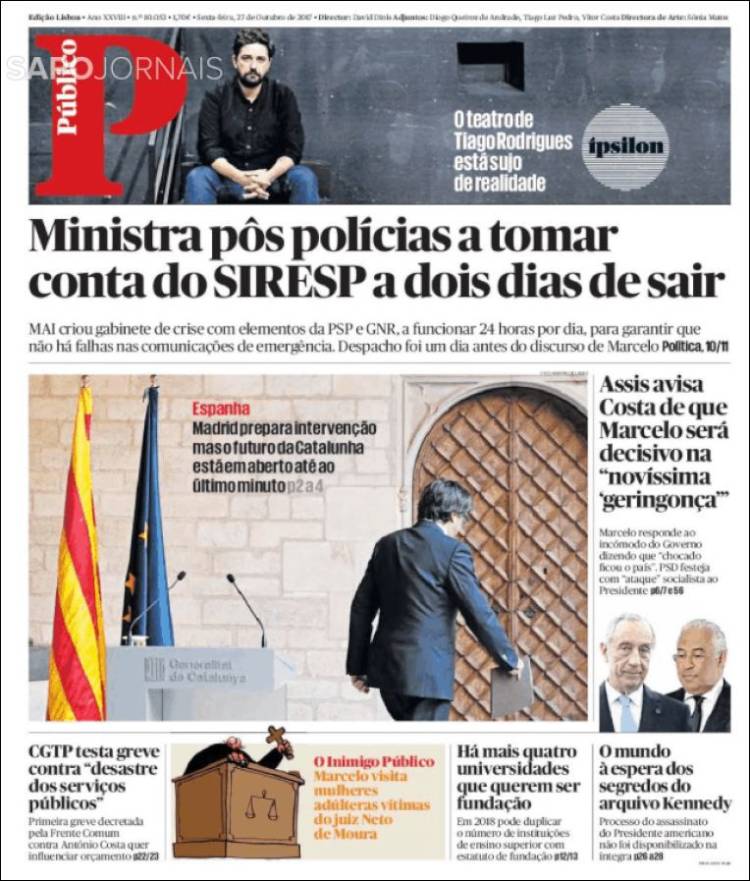 El diari Público, molt focalitzat en Catalunya en les últimes setmanes, treu Puigdemont en portada per anunciar que “Madrid prepara la intervenció a Catalunya” però que tot “està obert fins a l’últim minut”:
