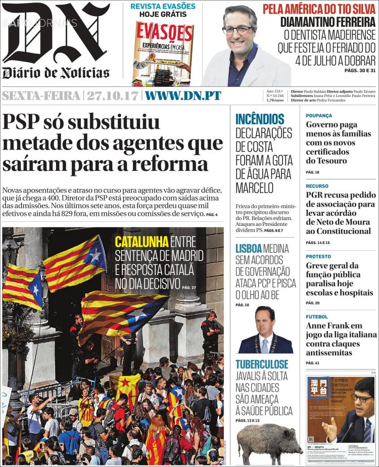 La foto del dia per al Diário de Noticias són els joves concentrats a la Plaça de Sant Jaume. “Catalunya: entre la sentència de Madrid i la resposta catalana en el dia decisiu”, titula: