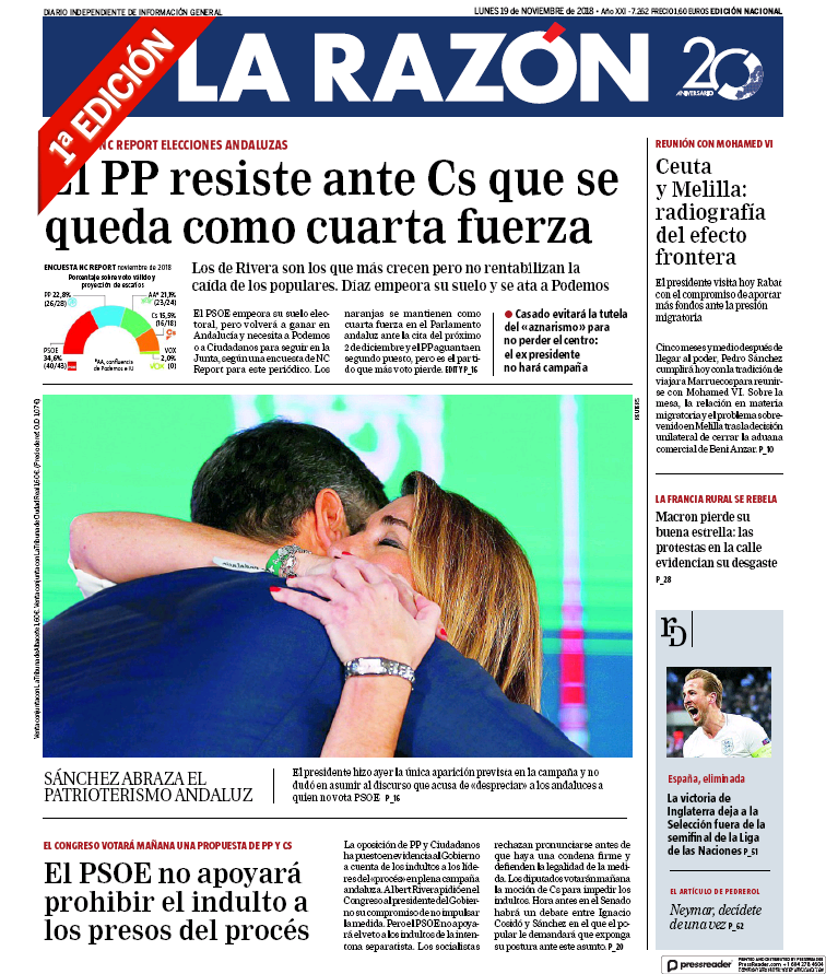 Val a destacar la tendresa de les fotos de Pedro Sánchez i Susana Díaz a El Mundo i La Razón. Ni els directors de campanya del PSOE d'Andalusia ho haurien volgut millor –malgrat que els dos diaris compensin la dolçor de l'escena amb uns titulars verinosos que diuen tot el contrari del que mostren les fotos.