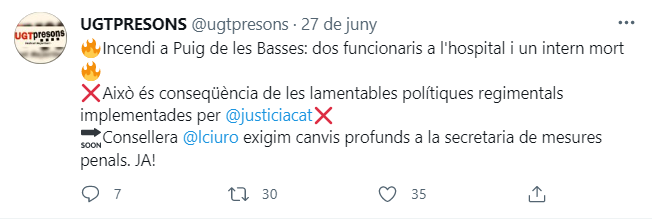 Divendres passat, un intern de 30 anys va morir a la presó de Puig de les Basses (Girona) després que ell i dos altres presos incendiessin dues cel·les. A més, quatre persones van resultar ferides. Els reclusos estaven aïllats en cel·les de règim tancat, conegudes com a DERT, en la que els interns estan tancats durant 21 hores al dia.