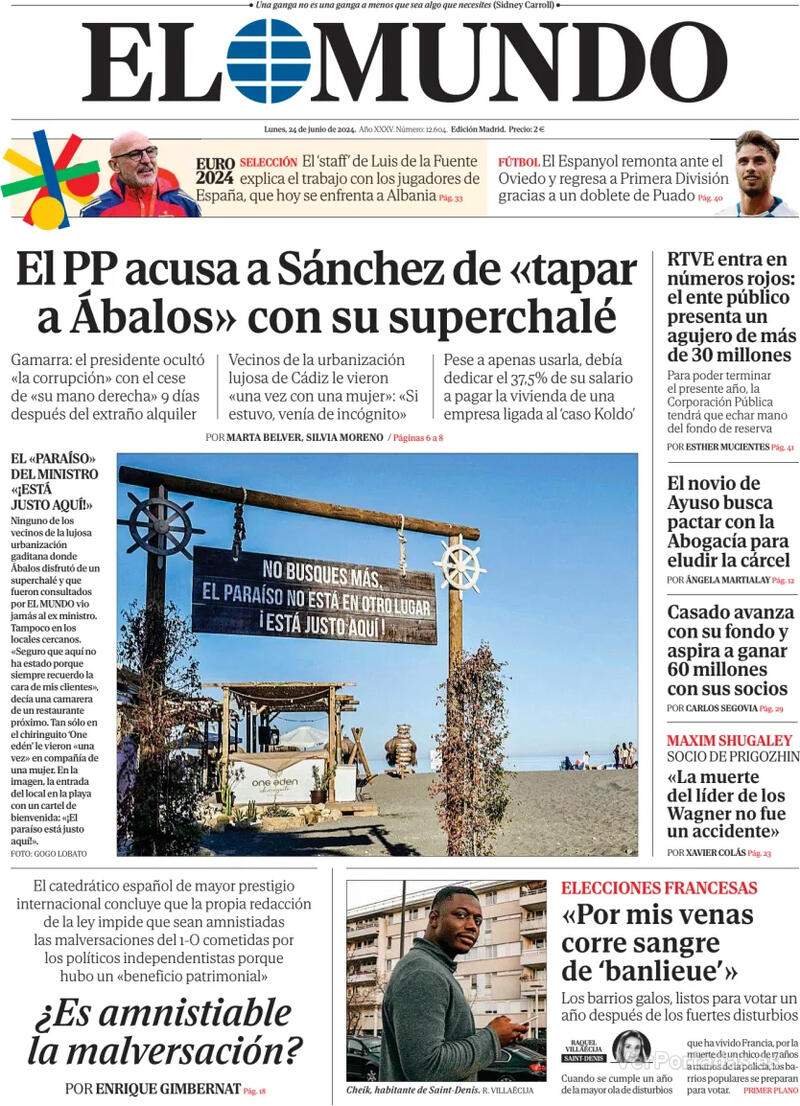 El Mundo segueix traient suc al cas Koldo i titula: "Ábalos gaudia del superxalet lligat a la trama de Koldo sense aixecar sospites: entre estrangers i després d'un mur vegetal de cinc metres". El diari es refereix a la trama que afecta l'exministre de Transports i exsecretari d'Organització del PSOE José Luis Ábalos i assegura que va llogar un xalet en una urbanització de luxe a prop de Gibraltar propietat de l'empresa Have Got Time SL., vinculada a Víctor de Aldama, un dels principals comissionistes del cas Koldo. Segons la investigació del diari, Ábalos va signar un contracte de lloguer de cinc anys amb opció de compra, però només va pagar el primer mes i la fiança. L'habitatge, però, va estar a la seva disposició uns sis mesos, entre el 2021 i el 2022. L'exclusivitat d'aquesta urbanització, habitada majoritàriament per estrangers, ha provocat que l'exministre "només fos vist una vegada" pels veïns de la zona. Sembla ser que la casa estava protegida per "un mur vegetal de cinc metres" i estava situada al carrer més amagat de tots". Fem també un cop d'ull a la resta de portades d'aquest dilluns: