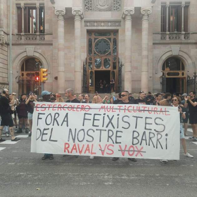 Veïns del Raval han fet una manifestació des del barri a les portes del Palau de Justícia per donar suport als seus conciutadans, i han cridat, tal com van fer fa quatre anys amb la visita de Vox: "Fora feixistes del nostre barri!". Els Mossos d'Esquadra han reforçat la vigilància exterior i interior de l'edifici judicial per a protegir els representants del partit ultra.