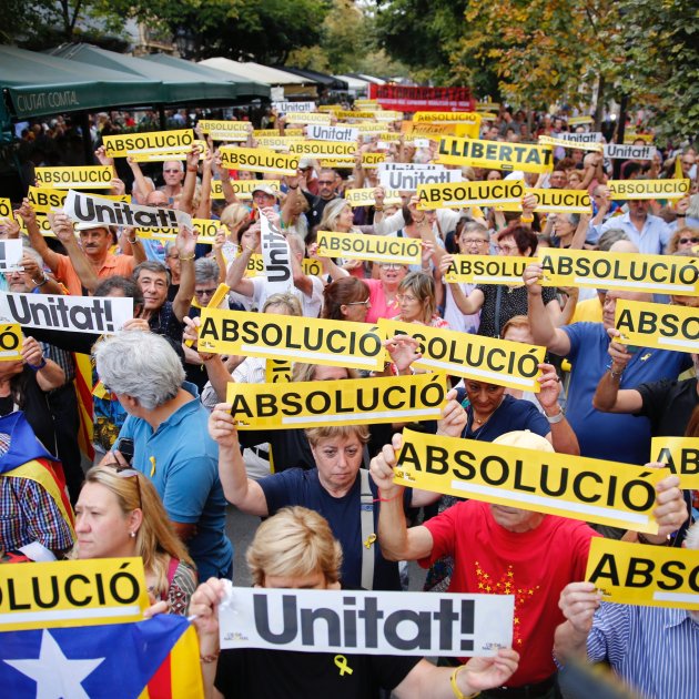 Damunt l'escenari on han anat desfilat els responsables d'anar llegint els diferents fragments, hi havia una fotografia dels dos dirigents independentistes. El públic exhibia constantment cartells reclamant: "Absolució" i "unitat".