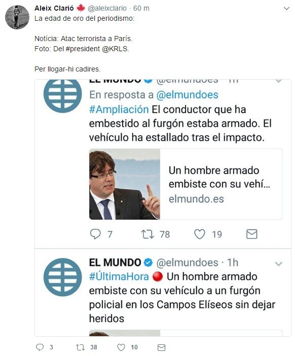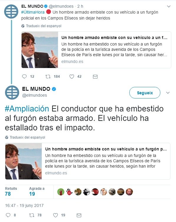 Estan de pega o estan enderiats. El Mundo ha il·lustrat el tuit on informa sobre l’atemptat de París d’aquest dilluns amb una fotografia de Carles Puigdemont. L’efecte que fa és que s’han descuidat de corregir-ho, però una pífia així es veu aviat i es fa estrany que no l'hagin esmenat dues hores després de publicar-lo, que és quan es publica aquesta informació. De fet, la mateixa foto apareix en un segon tuit que amplia el primer.