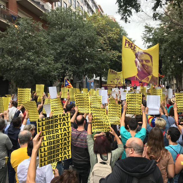 L'acte, en el que s'ha pogut escoltar un àudio d'Oriol Junqueras valorant la sentència i on s'han sentit crits d'"independència" i "llibertat", ha acabat amb el cant dels Segadors amb el puny alçat. Els assistents lluïen pancartes on es podia llegir "llibertat" i "amnistia", i també hi havia una gran pancarta de 'Free Junqueras'.