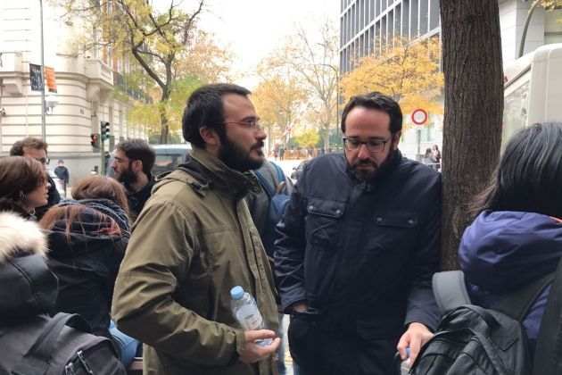 Si una imatge ha impactat als assistents, un cop l'autocar ha arribat escortat per la Policia Nacional a la porta del jutjat, ha estat la conversa de més de trenta minuts entre Anna Gabriel i el líder d'En Comú Podem a Madrid, Xavier Domènech. Domènech ha reiterat la idea de la llibertat d'expressió davant les càmeres i més tard ha conversat seriosament amb Gabriel. La xerrada entre els dos ha acabat amb rialles, i el podemista ha comparat les assemblees de la CUP amb el procés que Podemos encetarà de repensament del partit, de la reunió anomenada Vistalegre II, segons ha presenciat aquest diari.