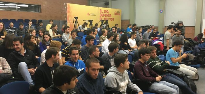 Aplaudiments i complicitat. Aquest és l'ambient que s'ha viscut aquest dimecres al migdia a la Facultat d'Economia i Empresa de la Universitat de Barcelona en un acte amb estudiants organitzat per les JERC –les joventuts d'Esquerra– i protagonitzat pels candidats a les eleccions generals Gabriel Rufián, Joan Tardà i Susanna Pagès. Els ha acompanyat el president d'ERC, Oriol Junqueras, que ha aprofitat per fer una classe magistral d'història i economia.