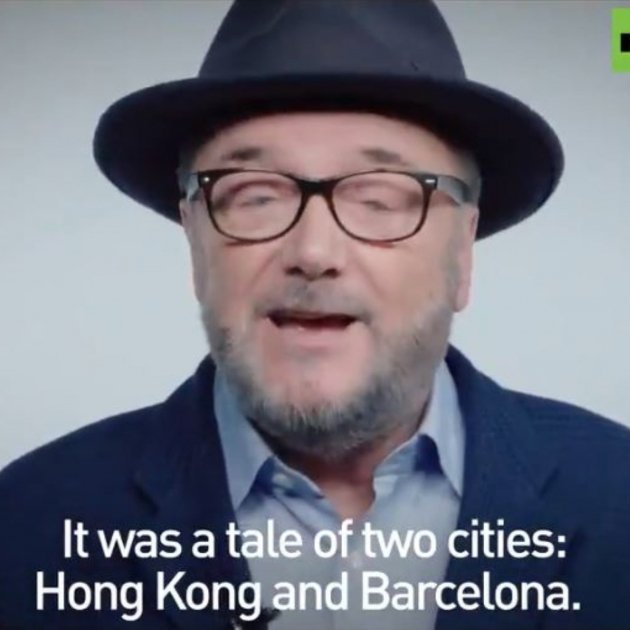 "Vet aquí que hi havia 2 ciutats: Hong Kong i Barcelona. Centenars de milers de persones protesten als carrers de Hong Kong, són manifestants democràtics, defensors de la llibertat. Milers de periodistes de mitjans occidentals han anat a Hong Kong per explicar-nos fins i tot el número de les sabates i tota mena de detalls familiars dels líders de les protestes de Hong Kong. L'esbiaix descarat a favor dels manifestants de Hong Kong es pot contrastar i comparar amb la reacció que tenen els mitjans occidentals i el virtual silenci total dels seus polítics, quan apareixen centenars de milers de persones a Catalunya protestant contra els 100 anys de presó contra 9 polítics catalans electes, pel greu delicte d'haver organitzat un referèndum no-oficial", assenyala Galloway.