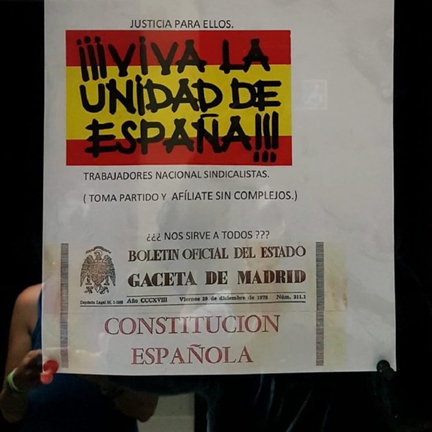 Segons la imatge que ha difós via twitter, es veu com algú hi ha penjat un full signat pel sindicat falangista Trabajadores Nacional Sindicalistas (TNS), que té una secció sindical al Congrés dels Diputats, on mostren el seu suport amb els “treballadors i ciutadans anònims que s’han vist desplaçats, perjudicats i acomiadats per culpa del procés separatista i “victimista” català.”