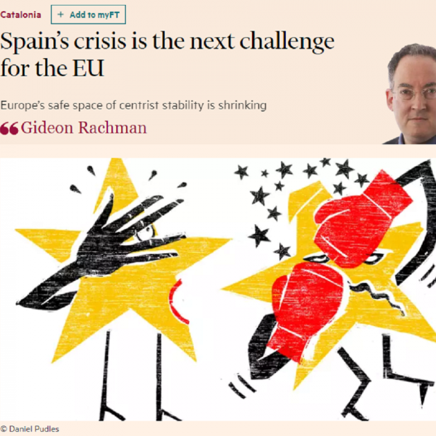 Segons el diari, si l'Estat espanyol entra en una "crisi prolongada i perillosa", llavors la "feliç història" de l'ingrés d'Espanya a la UE es pot veure amenaçada "per un gir inesperat". A més, l'"autoimatge de la UE com a garant de la pau i l'estabilitat dins d'Europa es pot veure soscavada", afegeix. "Per aquesta raó -afegeix l'FT-, l'actual situació a Espanya pot representar a la llarga un desafiament encara més gran per a la UE que el Brèxit (la sortida britànica de la UE)", afirma l'editorial.