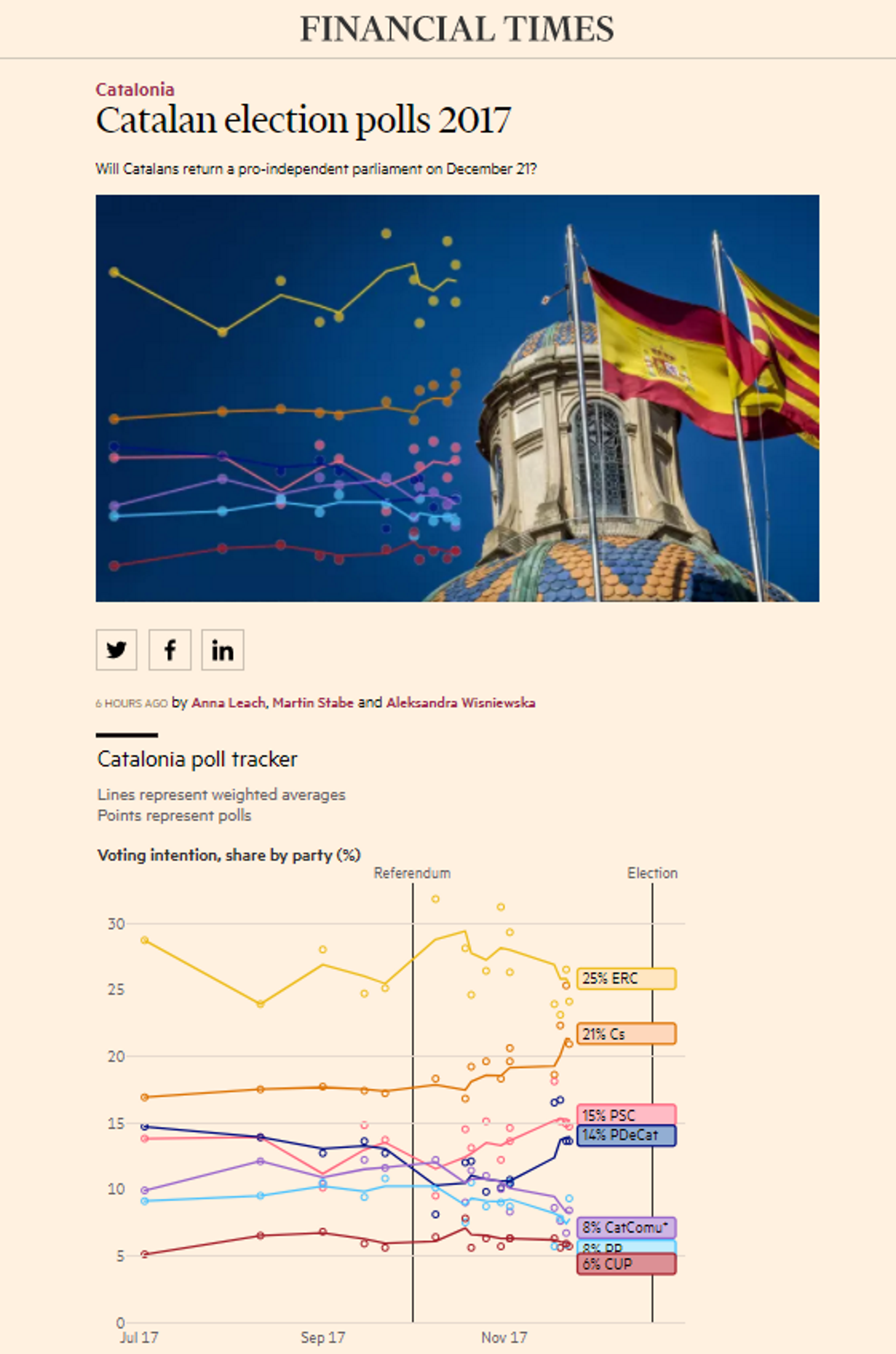 El diari britànic Financial Times ha obert un especial sobre les eleccions catalanes del 21 de desembre, amb tota mena de dades i un recull de les enquestes que es van publicant. El rotatiu considera que els comicis tindran transcendència. "Els catalans reeditaran un Parlament independentista?", es pregunta el rotatiu econòmic.