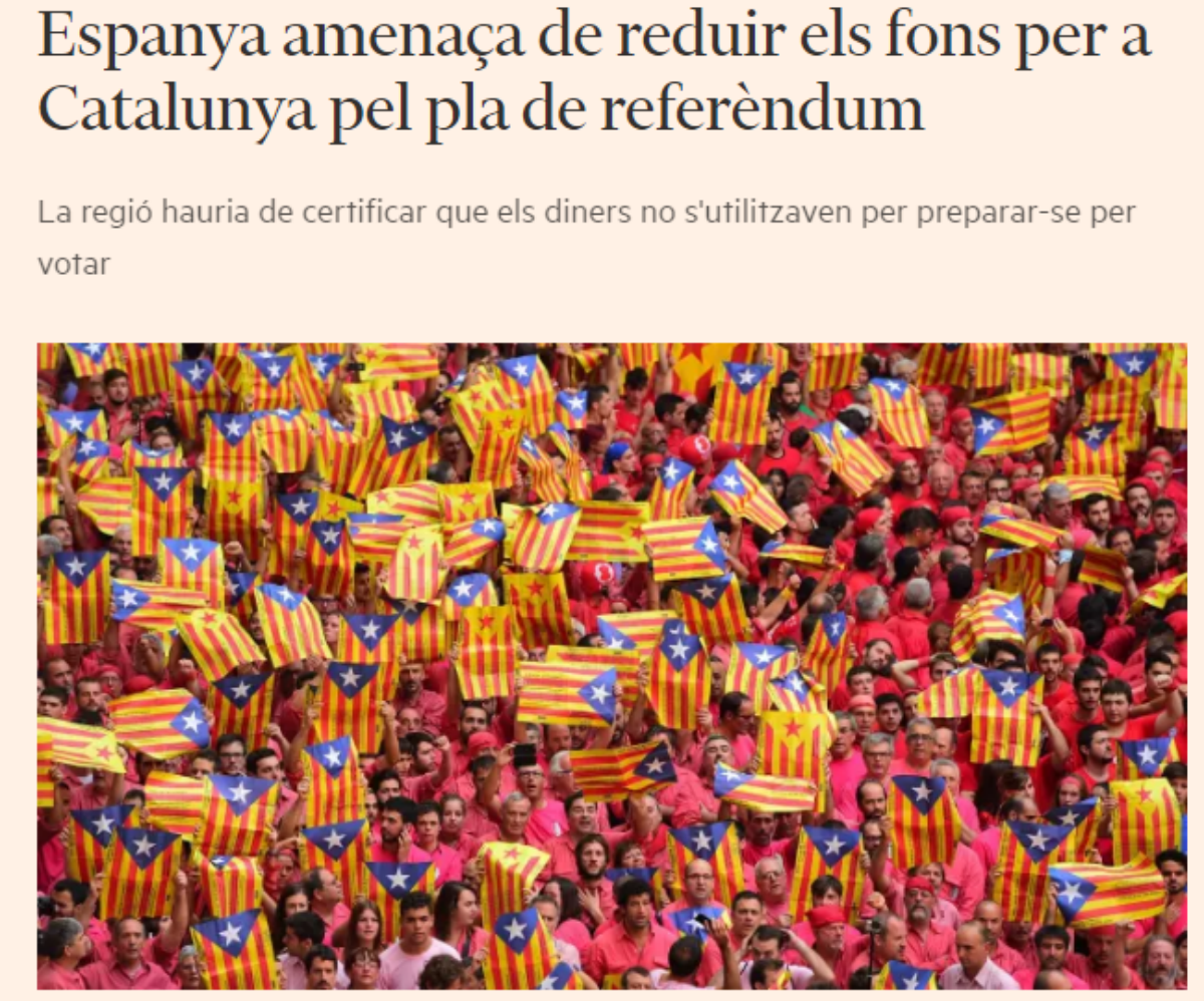 "Espanya amenaça de retallar els fons a Catalunya pel pla del referèndum". Sota aquest titular, el prestigiós diari Financial Times es fa ressò de l'advertència del govern espanyol de suspendre el Fons de Liquiditat Autonòmic (FLA) si el Govern destina despeses per al referèndum.
