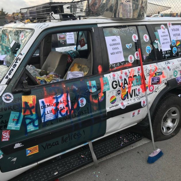 Igualment s'assenyala al president d'Òmnium, Jordi Cuixart, que, al costat de Jordi Sànchez, van pujar a un cotxe de la Guàrdia Civil per cridar "a la mobilització permanent". Mentrestant, afegeix la denúncia, "tres vehicles oficials de la Guàrdia Civil van ser atacats per la multitud, obligant els agents a refugiar-se a l'edifici".