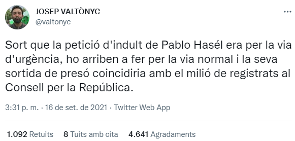 A principis de més, veient que aquestes peticions no prosperaven i no arribava cap novetat sobre el possible indult a Hásel, Valtònyc va ironitzar sobre la situació a Twitter. "Sort que la petició d'indult de Pablo Hasél era per la via d'urgència, ho arriben a fer per la via normal i la seva sortida de presó coincidiria amb el milió de registrats al Consell per la República", va escriure el raper exiliat en una piulada.