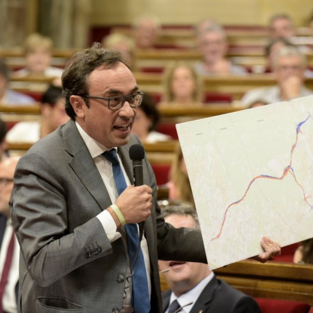 El grup ha preguntat aquest dimecres, durant la sessió de control al Govern, sobre "l'aturament cautelar de la prolongació de la C32". Rull ha fet servir un gran mapa per exemplificar la seva resposta i explicar les accions que està portant a terme el Govern.