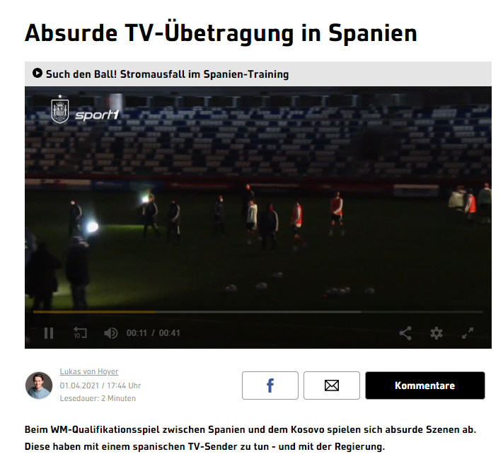 L'emissió de TVE del partit de futbol entre Espanya i el Kosovo ha aixecat fortes crítiques a Alemanya, pel menyspreu continu que va mostrar cap al país balcànic. El canal d'esport alemany Sport 1 ha carregat amb duresa contra l'actitud espanyola, i ha titllat d'"absurda" l'emissió, en la qual es va arribar a l'extrem d'evitar citar el nom del país i es van posar les inicials en minúscula quan les d'Espanya apareixien en majúscula. "La cadena de TVE va oferir dimecres al vespre un espectacle grotesc", ha afegit.
