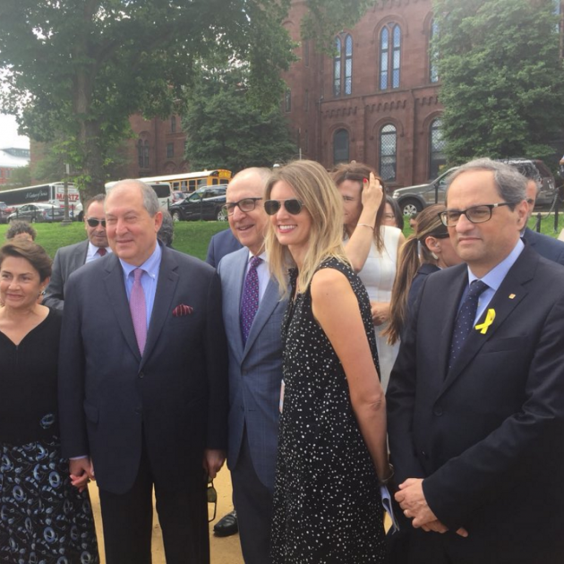 El president de la Generalitat, Quim Torra; el president d'Armènia, Armen Sarkissian, i una representant de la secretaria d'Estat nord-americana, Marie Royce, s'han fet una fotografia conjunta avui dijous, després d'acabar l'acte d'inauguració del Festival Smithsonian a Washington.