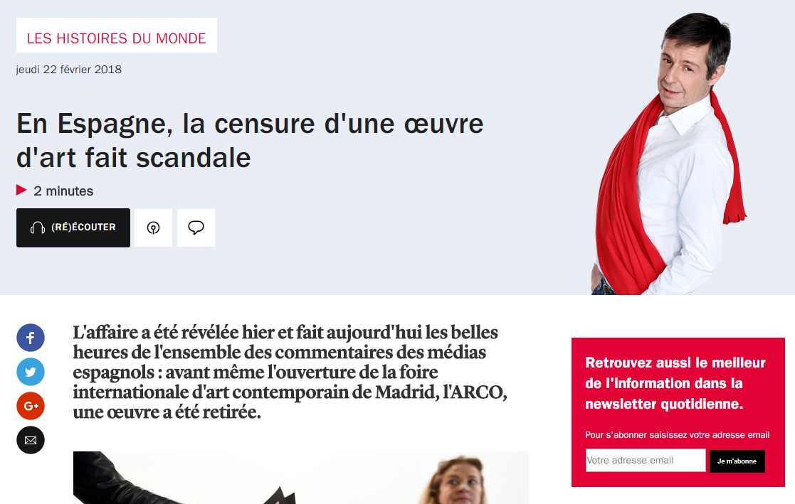 En una crònica de l'analista Anthony Bellanger, a partir de la censura a l'exposició Arco, l'emissora repassa el deteriorament del periodisme espanyol. "Catalunya fa embogir Espanya. No hi ha gaire a dir. Per tots els qui coneixen bé Espanya i que estan acostumats a llegir la seva premsa, ara gairebé s'ha convertit en un turment passar per les pàgines de El Mundo, un diari conservador, i també per les del venerable El País", assenyala.