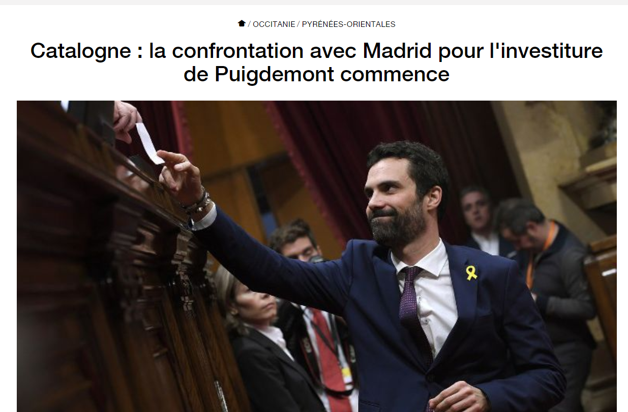 L'emissora pública de radiotelevisió France3 ha indicat que amb l'elecció de Roger Torrent com a president del Parlament, comença ara "la confrontació amb Madrid per a la investidura de Carles Puigdemont".