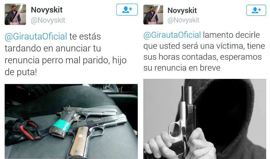 El perfil anònim va contestar amb dos missatges de contingut amenaçador: "Estàs trigant a anunciar la teva renúncia gos mal parit, fill de puta" i "lamento dir-li que vostè serà una víctima, té les hores comptades, esperem la seva renúncia en breu".