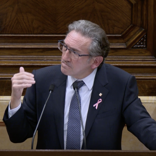 A la imatge principal, el conseller Jaume Giró durant la seva seva intervenció davant de l'hemicicle