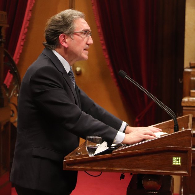 A la imatge principal, el conseller d'Economia, Jaume Giró, durant la seva intervenció al Parlament