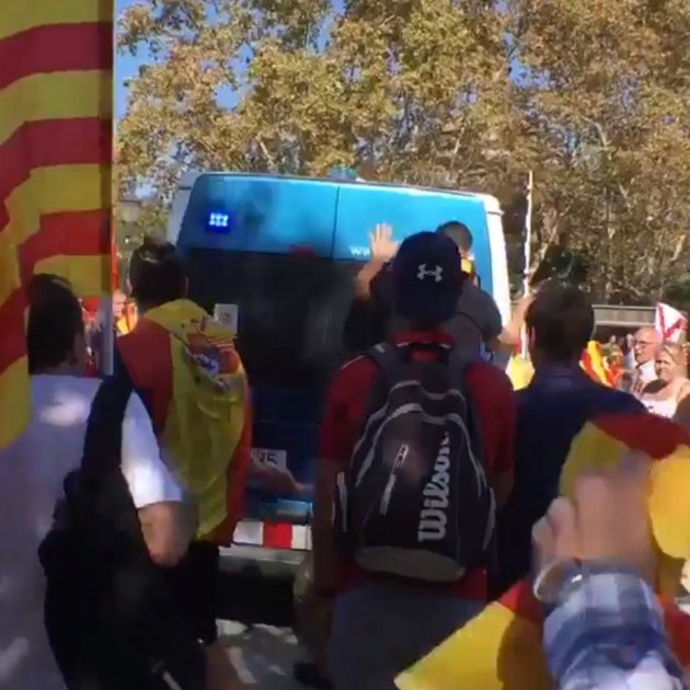 Un grup de manifestants que sortia de la marxa espanyolista de Barcelona ha envoltat dos mossos que eren en un cotxe policial a la Rambla i els ha increpat, fins al punt que han hagut d'abandonar el vehicle i s'han hagut de refugiar en un establiment comercial. Com que la tensió no ha afluixat, s'han refugiat finalment a la comissaria de la Guàrdia Urbana al districte de Ciutat Vella.