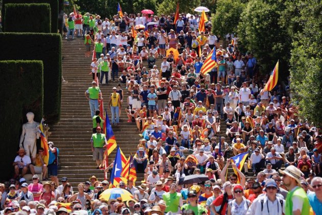 L'escenari, sota les quatre columnes i mirant cap al Palau Nacional amb la plaça i les escalinates plenes de gom a gom, donava l'esquena a milers de persones que s'anaven concentrant a l'avinguda Maria Cristina. Unes 40.000 persones, segons els organitzadors. D'això es tractava. Les entitats han volgut fer una demostració de força per advertir l'Estat que "no hi ha prou presons per tancar la voluntat democràtica de tot un poble", i així ho han subratllat els responsables de les entitats en les intervencions des de l'escenari.