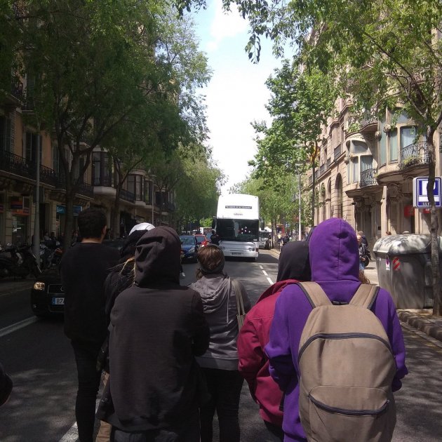 Els anticapitalistes, que han aturat l'autobús al carrer Pau Claris amb València, han exclamat consignes com "fora feixistes dels nostres barris" o "l'avortament és un dret" des de Twitter on han penjat un vídeo on es veu com agents dels Mossos d'Esquadra els aparten de davant de l'autobús.