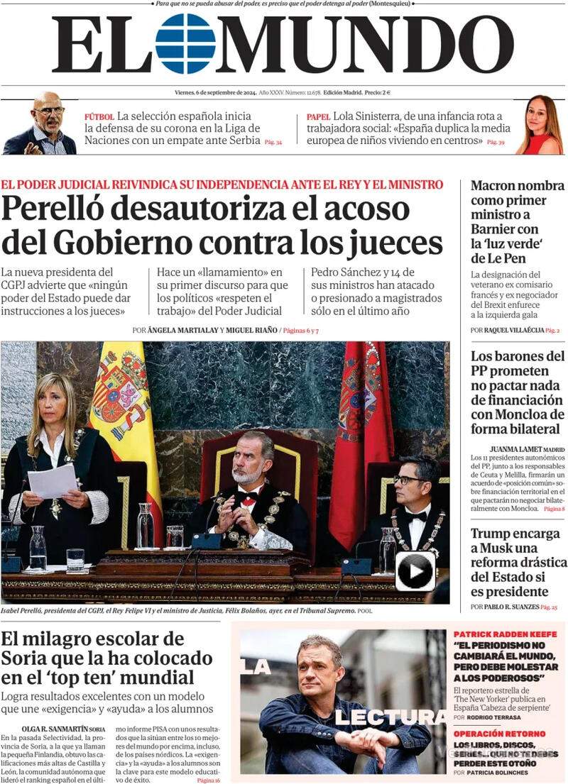 La nova presidenta del Consell General del Poder Judicial (CGPJ) i del Tribunal Suprem, Isabel Perelló, ha reclamat en el seu primer discurs durant l'obertura de l'any judicial, “a les diferents forces polítiques i als poders de l'Estat” que “respectin la tasca dels jutges i magistrats”, i ha advertit que “cap poder de l'Estat pot donar indicacions ni instruccions sobre com han d'interpretar i aplicar l'ordenament jurídic”. “Només aquells estats on la divisió de poders està garantida són realment estats de dret”, ha afirmat, i per tant cal “salvaguardar la independència judicial davant possibles ingerències externes”. Aquesta ha estat la seva carta de presentació, una clara al·lusió a les paraules d’Óscar Puente, criticant que el Suprem s’hagi “extralimitat” en la interpretació de l’amnistia i a la demanda de Junts que la Fiscalia es querelli contra el Suprem per la no-aplicació de l’amnistia a Puigdemont. L'acte d'obertura, que es va celebrar aquest dijous, estava presidit pel rei Felip VI, hi van assistir els màxims representants de tots els estaments judicials, a més del ministre de justícia, Félix Bolaños, la vicepresidenta segona, Yolanda Díaz, i el líder del PP, Alberto Núñez Feijóo. El discurs inaugural de Perelló l'ha convertit en la reina de les portades d'aquest divendres i El Mundo titula: “Perelló desautoritza l'assetjament del govern espanyol contra els jutges”, indica apuntant que “fa una crida en el seu primer discurs perquè els polítics respectin la feina del Poder Judicial” i que “Pedro Sánchez i 14 dels seus ministres han atacat o pressionat magistrats només en l'últim any”.